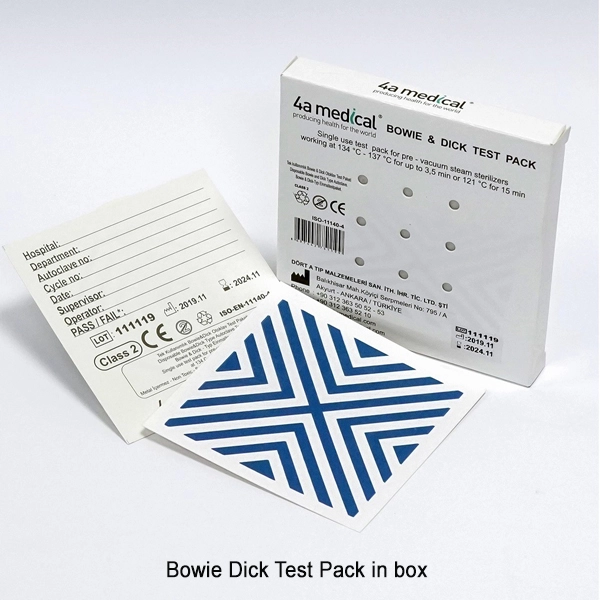 4A Bowie-Dick Test Packs are diagnostic tools that must be used daily before starting the steam sterilization process. These test packs are used to verify efficient steam penetration and to detect any air leakage within the steam sterilizer.